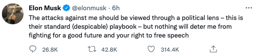 最後馬斯克做結尾:「很明顯,他們(媒體)唯一的目地是要干擾收購 Twitter」不過稍早馬斯克在這篇文章寫出來以前,就表達:「未來幾個月對我的政治攻擊將急劇擴大」也引起討論!而你對馬斯克被爆用「送馬換性愛」、700 萬台幣作性醜聞封口費,以及他表達這是「政治攻擊」有什麼想法?歡迎留言告訴我們,另外亦可查看:「馬斯克誇讚中國「微信」功能全面,Twitter 或可加入「支付服務」」。