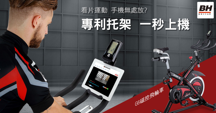 2018 年熱銷經典款 G6 磁控飛輪車,為了方便消費者居家使用。BH獨家研發將配件進行升級改款。將原有的電子錶升級為可置放手機、平板的專利電子錶+托架組。托架可無段式調整高度,不論是手機、平板皆能安穩置放。