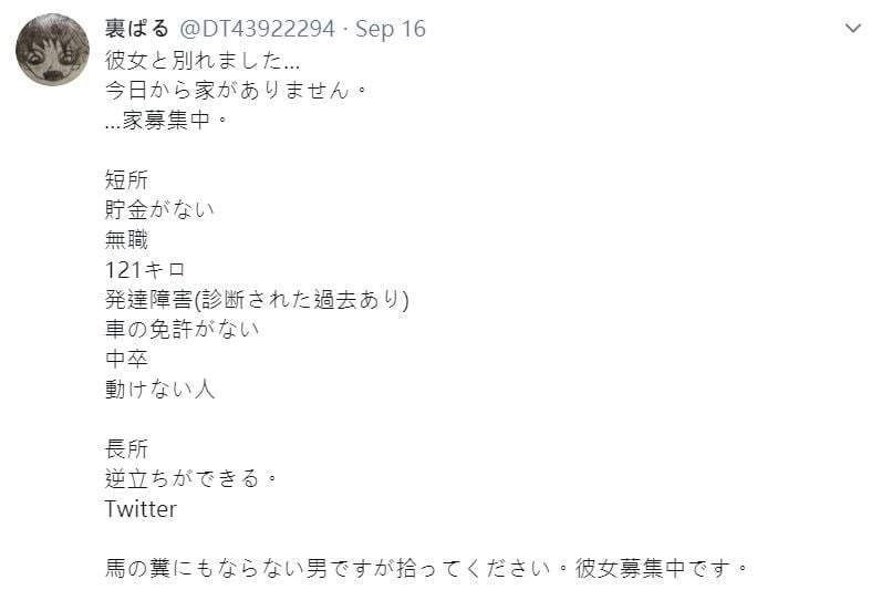 日本有一名 24 歲的主播主「ぱるぱる( ParuParu )」,因為其貌不揚,又沒有穩定工作,而被網友用「肥、窮、醜、毒」形容。但是這樣的他卻有一個神級女友「えるまる( Erumaru )」,對方不僅是大正妹,還供吃供住,讓網友直封 ぱるぱる 為「勵志哥」。近期兩人吵架分手,結果這名勵志哥不出 3 天,居然又交了新女友,在網上引起熱議。(延伸閱讀:「關關」公開「高解析近拍畫面」揭身體部位「嚴重凹陷」不自覺摳到滿是坑:我知道很醜⋯)