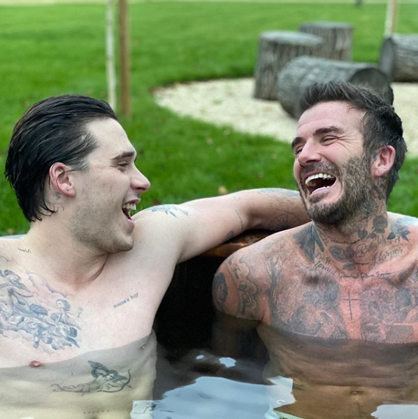 含著金湯匙出生的布魯克林現在不用上學,就在周末與爸爸貝克漢一起悠閒在郊外一起泡露天浴。在照片中 20 歲的小鮮肉布魯克林與「最強帥爸」一起打赤膊展露刺青肉體,你認為哪一邊的身材更吸引人呢?